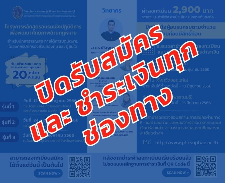 – รุ่นที่ 1 รายชื่อผู้มีสิทธิ์และตรวจสอบที่อยู่ออกใบเสร็จ ( ถ้าผิดให้ส่งข้อมูลที่ถูกต้องส่งอีเมลล์พร้อม ระบุชื่อสกุลมาที่ training-1@www.phcsuphan.ac.th )